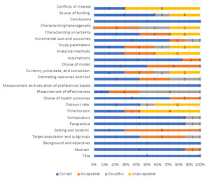In general, the weakest methodological criteria among the selected group of articles were obtaining measures of effectiveness, analytical methods, characterization of both uncertainty and heterogeneity, and declaration of conflicts of interest. The percentages of acceptability for these criteria among the set of articles are shown in Figure 2.