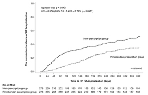 The cumulative incidence of rehospitalization estimated using the Kaplan–Meier method was lower in the pimobendan prescription group at 365 days, but the difference between the groups disappeared at approximately 1500 days. As follow-up would have already been complete for many patients, this may have been due to the small number (about 10) of patients available for analysis at this time, reducing the comparability of the groups. Thus, this finding should be very carefully interpreted.