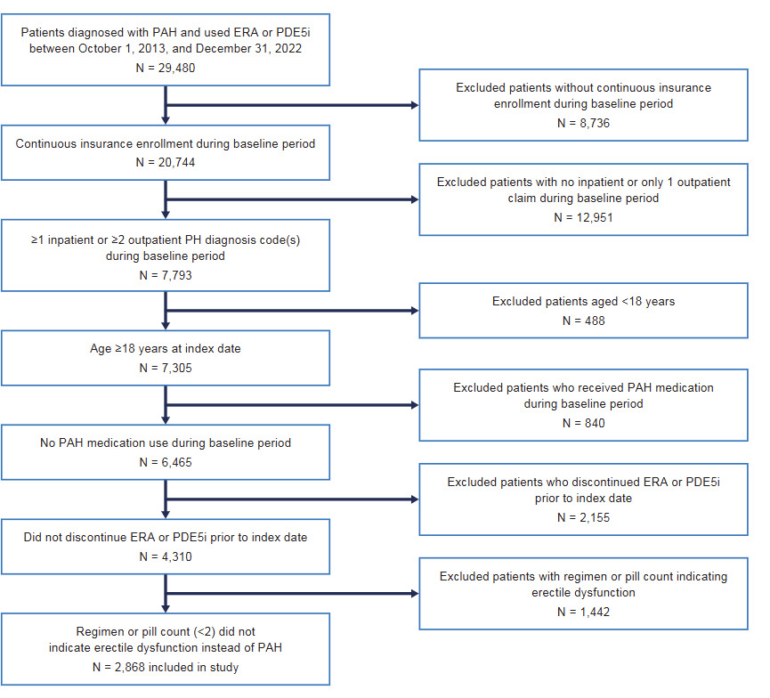 Patients were eligible for the study if they were at least 18 years of age, had at least 1 diagnosis code for PH (Internal Classification of Diseases [ICD], Ninth Revision, 416.0 primary PH and 416.8 PH secondary/unspecified; and ICD, Tenth Revision, I27.0 primary PH, I27.20 PH secondary/unspecified, I27.21 secondary PAH, and I27.89 other specified pulmonary heart diseases) in an inpatient or emergency room setting and at least 2 diagnoses of PH on separate days in an outpatient setting, had a new ERA or PDE5i claim, and were continuously enrolled with medical and pharmacy benefits during the 6-month baseline period before the index date. To avoid inclusion of patients receiving a PDE5i for erectile dysfunction, those initiating a PDE5i at index were required to have a prescription for at least 2 pills per day (for PAH, sildenafil is taken ≥3 times per day and tadalafil is taken ≥2 times per day or once daily in the form of 2 pills [total 40 mg]). Patients were excluded if they had received a PAH medication during a 6-month window prior to their first observed PAH therapy (baseline).