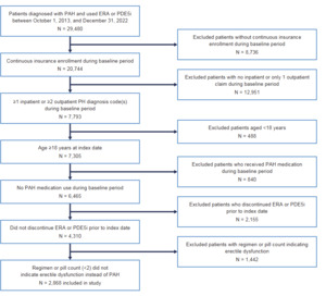 The limitations of our study are common to studies that use retrospective claims data. In particular, administrative claims data are subject to potential coding errors and inconsistencies, data cannot be generalized to the entire US population, the presence of a claim for a dispensed prescription does not indicate that the medication was taken as prescribed, PAH medications or other medications that were administered in the inpatient setting are not captured in the database, and information such as clinical and laboratory results and disease-specific parameters such as risk score are not readily recorded in claims data. Accurate identification of patients with PAH is a challenge in analyses of claims data because no specific diagnostic code for PAH exists (forthcoming in ICD-11). Identification of patients in our study relied on a diagnostic code for PH and prescription of an ERA or a PDE5i (with restriction of PDE5 inhibitors to PAH-specific doses and regimens). Right heart catheterization was not an inclusion criterion as a previous study has validated the identification algorithm used in our study (and other similar PAH studies) and has shown that including an right heart catheterization requirement does not increase the sensitivity or positive predictive value of the algorithm.28