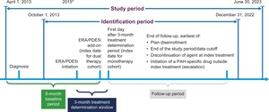 The study design is shown in Figure 1. Patients initiating an ERA or a PDE5i between October 1, 2013, and December 31, 2022, were identified; the full study period was April 1, 2013, to June 30, 2023, to allow for a 6-month baseline period. Assignment to the dual-therapy or monotherapy cohort was based on a 3-month treatment determination period that began at initiation of the first ERA or PDE5i. This 3-month period reflects the authorization and processing time that it can take in real-world US clinical practice for patients to obtain ERA medication even when the ERA and the PDE5i are prescribed at the same time for use as dual therapy.