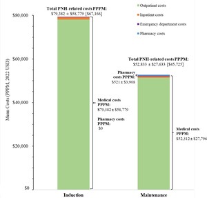 Annualized total PNH-related costs PPPY were estimated over the first year of treatment as the mean total PNH-related cost in the induction phase plus the mean total PNH-related cost PPPM in the maintenance phase multiplied over 11 months. For subsequent treatment years, the annualized PNH-related costs PPPY were calculated as the mean total PNH-related costs PPPM during the maintenance phase multiplied over 12 months. Data management and analyses were performed using SAS Enterprise Guide software version 7.1 (SAS Institute, Cary, North Carolina).