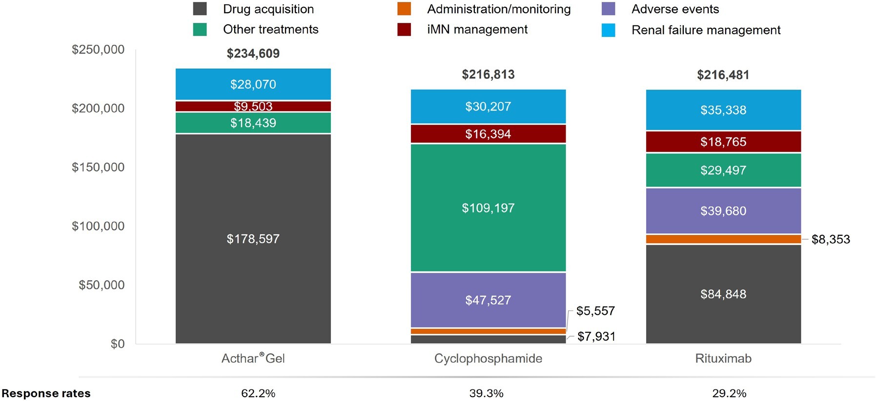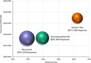 Acthar® Gel was a dominant treatment strategy in this economic evaluation vs unapproved treatments, cyclophosphamide and rituximab at 2 and 3 years, with lower costs and higher response rates (Supplementary Table S2).
