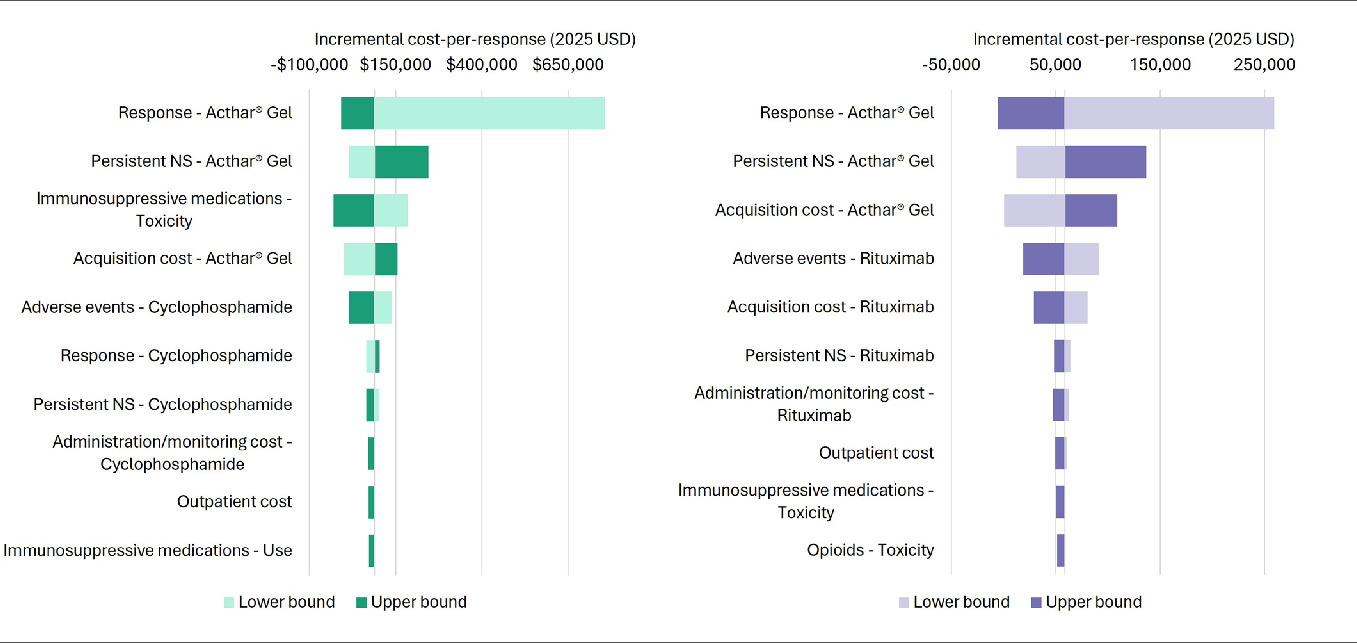 Deterministic sensitivity analysis revealed that the higher response rate associated with Acthar® Gel was the primary factor driving its lower cost per response compared with SoC. Several other important cost drivers contributed to the more advantageous economic profile of Acthar® Gel relative to both SoCs. Other key drivers were a lower or similar probability of patients treated with Acthar® Gel progressing to the persistent NS health state, a higher likelihood of SAEs with SoC, and the higher initial acquisition cost of Acthar® Gel. Further analysis identified specific factors that were key drivers in the individual comparisons between Acthar® Gel and the off-label therapies. In the comparison with cyclophosphamide, a higher probability of immunosuppressant-related toxicity associated with cyclophosphamide was a significant factor. Similarly, the higher acquisition cost of rituximab was a key driver in its respective comparison with Acthar® Gel.