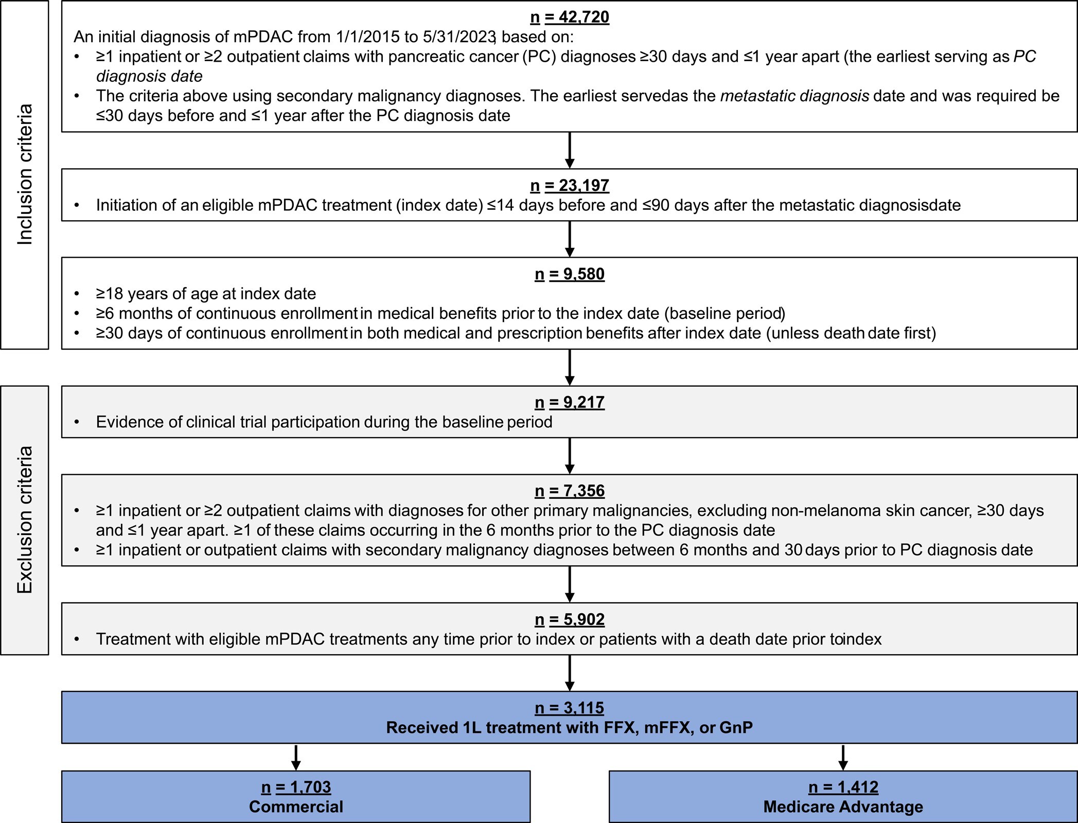 Patients at least 18 years old with a diagnosis of mPDAC from January 1, 2015, through May 31, 2023, were included in the study. Diagnosis of mPDAC was defined by both a pancreatic cancer diagnosis and a metastatic diagnosis. The pancreatic cancer diagnosis was determined by the presence of at least 1 inpatient or at least 2 outpatient claims with diagnosis codes ICD-9-CM 157.xx (excluding 157.4) or ICD-10-CM C25.xx (excluding C25.4) at least 30 days and up to 1 year apart. The metastatic diagnosis date was the earliest of at least 1 inpatient or at least 2 outpatient claims with diagnoses for secondary malignancies (ICD-9-CM: 196.xx-198.xx, ICD-10-CM: C77.xx-C79.xx) separated by at least 30 days and up to 1 year. The metastatic diagnosis was required to be at least 30 days prior to or up to 1 year after the pancreatic cancer diagnosis. Other inclusion criteria were initiation of 1L FFX, mFFX, or GnP up to 14 days before and up to 90 days after metastatic diagnosis, with treatment start defined as index date; at least 6 months of continuous medical enrollment pre-index (baseline period) and at least 30 days of continuous medical and pharmacy enrollment post-index, unless death occurred first. Death dates were set to the last day of the month.