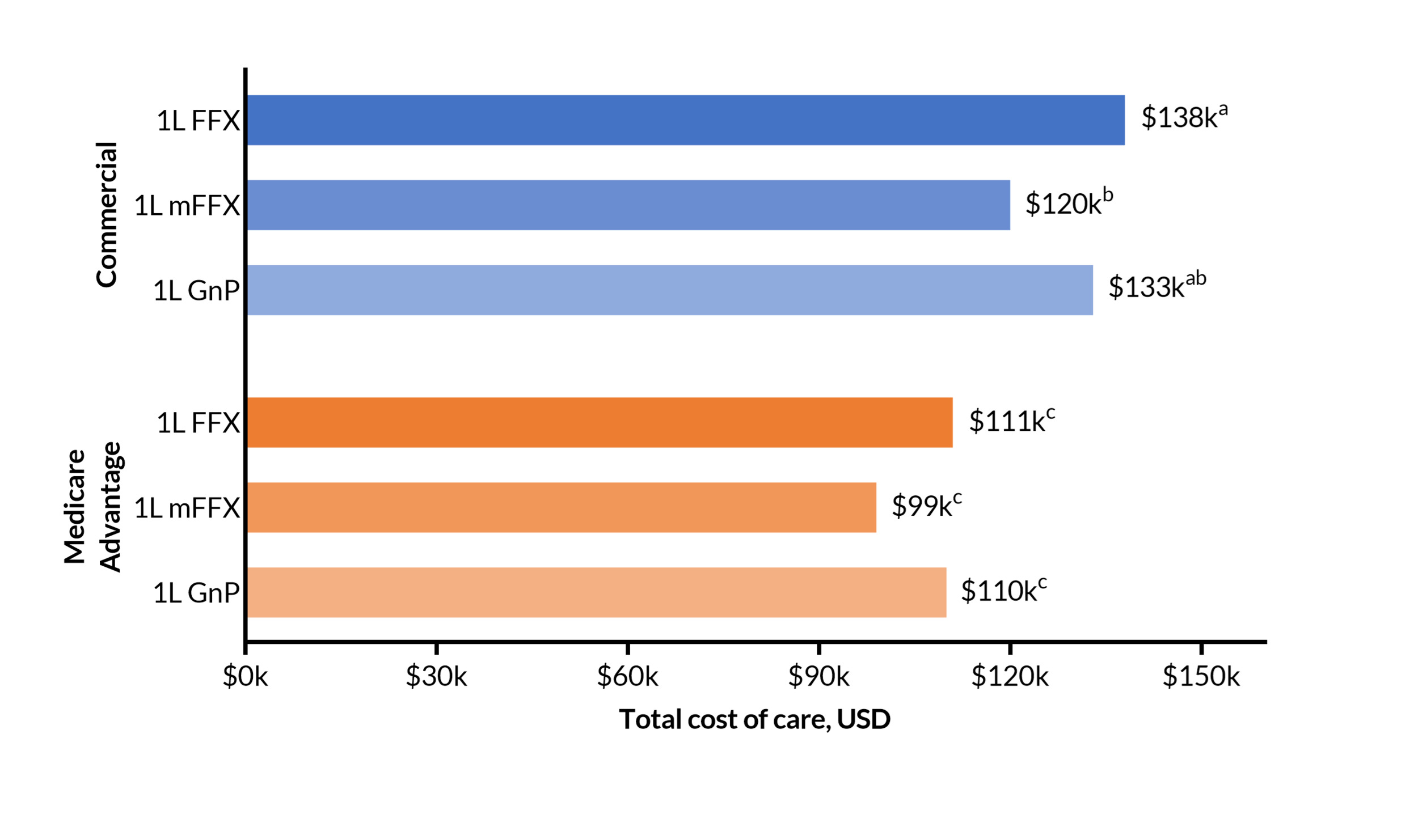 Similar studies comparing costs by payer type in this setting are limited. In a real-world study of patients with commercial insurance vs Medicare Fee-For-Service, Tomicki et al17 also found similar mean TCoC between 1L FFX and 1L GnP within payer type. The study did not stratify by FFX and mFFX. The authors found mean TCoC was nearly 3 times higher in the commercially insured group vs the Medicare Fee-For-Service group. This contrasts with our study findings, in which the mean TCoC was approximately 1.2 times greater for commercial insurance vs Medicare Advantage. The difference in result is likely due to the standardized cost estimate used in our study, which adjusts prices across health plans and providers to the same payment schedule.