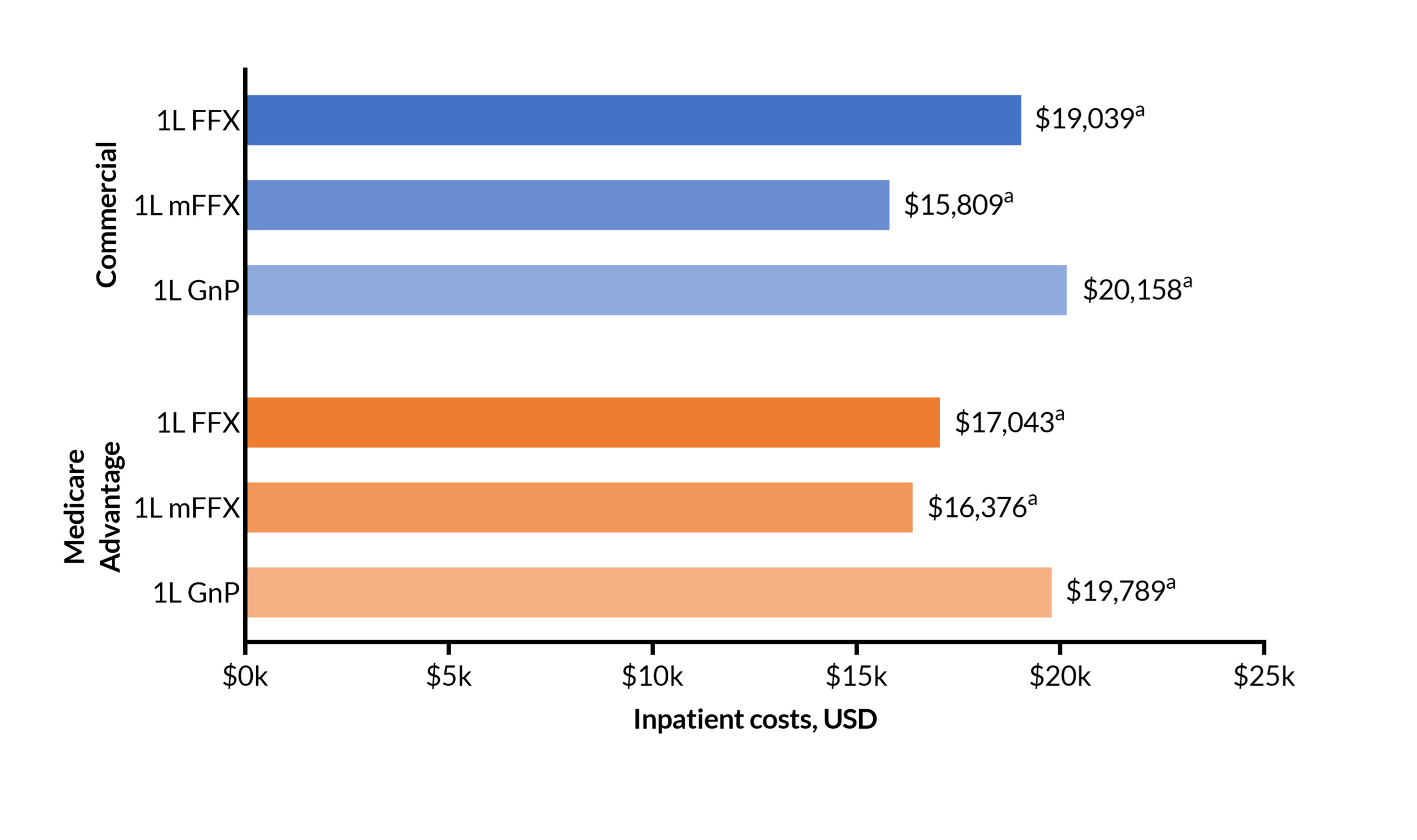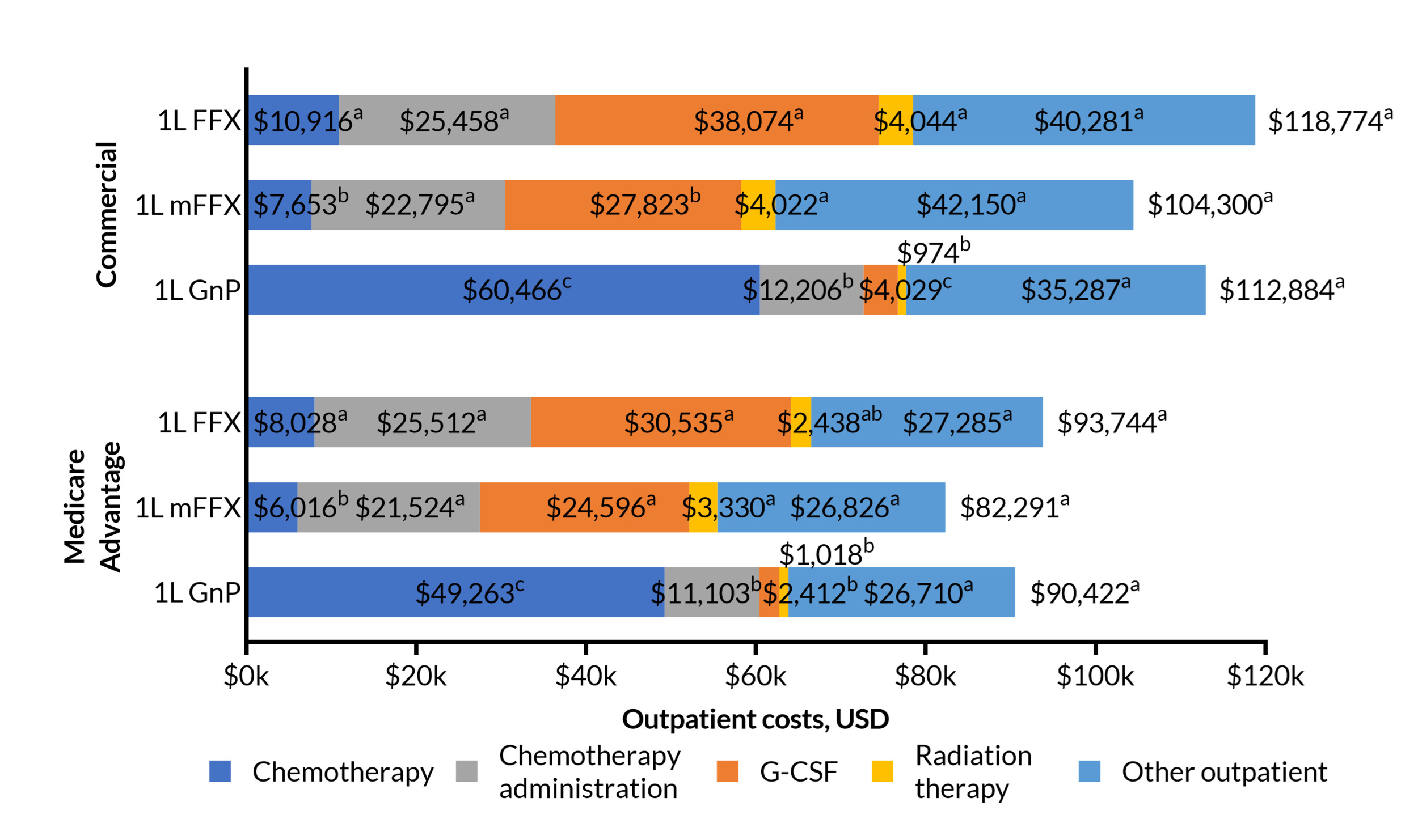 For all 3 treatment groups (FFX, mFFX, and GnP), 1L total unadjusted all-cause healthcare costs (TCoC) were calculated and reported by insurance type (commercial or Medicare Advantage). TCoC was divided into the mutually exclusive categories of inpatient costs (ICU- and non-ICU-related) and total outpatient costs. The latter were further subdivided into costs for chemotherapy drugs; chemotherapy administration (injection/infusion costs and non-G-CSF supportive care, such as antiemetics, hydration, and erythropoiesis-stimulating agents); G-CSF acquisition and administration; radiation therapy; other outpatient medical (costs under the medical benefit not included in the previous components, such as office visits, labs, and physician-administered drugs not included in the other categories); and other outpatient pharmacy (costs under the pharmacy benefit).