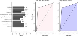 The AUC values of 0.88 on the training data and 0.80 on the test data suggested that the model performs better on the data it was trained on than the unseen test data (Figure 5). The BN only provided prediction in discrete form; hence, the AUC curves were straight lines. An AUC of 0.88 on the training set indicated that the model effectively distinguished between high and low risk in the training data, showing strong performance in identifying patterns and relationships within this data set. However, the drop to 0.80 on the test data indicated a slight reduction in performance when the model is applied to new, unseen data.