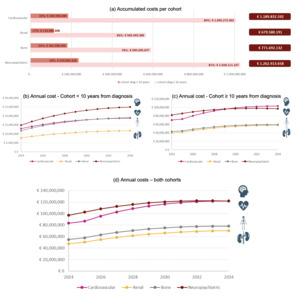 Modifying the prevalence in the cohort with a diagnosis ≥10 years with a second SA using the VACH9 study resulted in a difference of €382 080 142, €74 217 924, and €107 772 536 for cardiovascular, renal, and bone respectively (Supplementary Figure S2) (neuropsychiatric comorbidities were not included in this study).