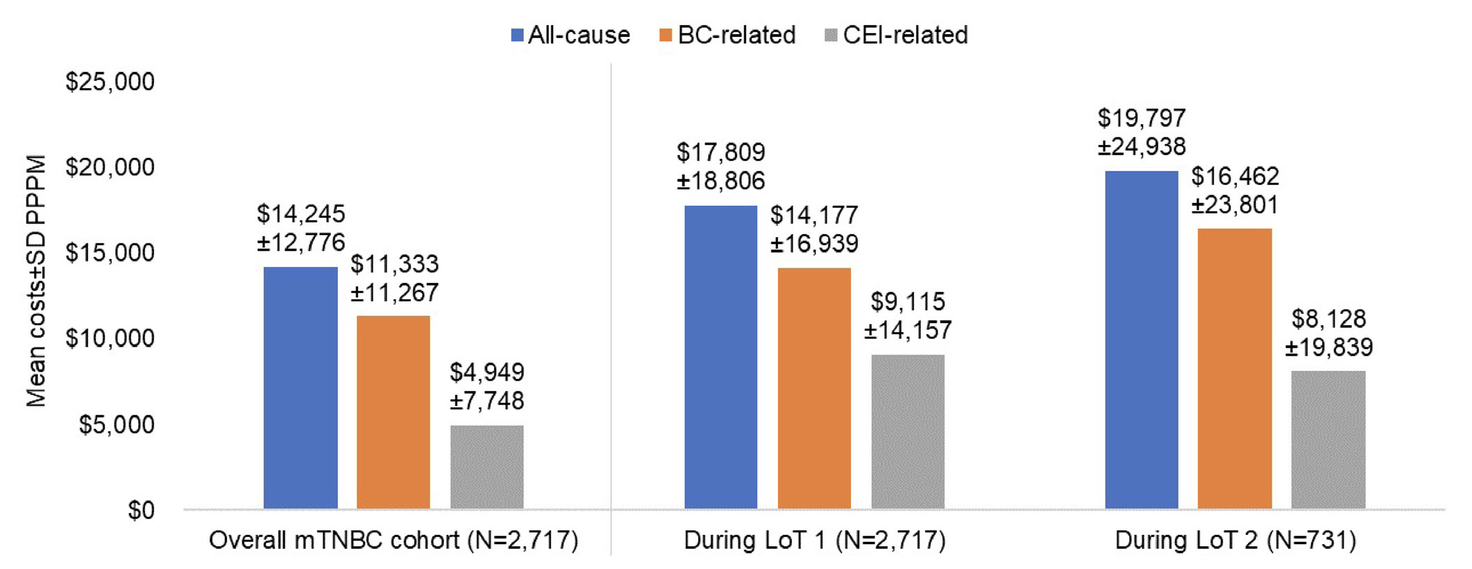 Our study findings also confirm the high economic burden of mTNBC reported in previously published studies. The mean all-cause healthcare cost PPPM for our mTNBC cohort was $14 245 during follow-up, with higher costs during LOT 1 ($17 809) and LOT 2 ($19,797). Given that the patients were predominantly treated with chemotherapy and not with PD-L1 inhibitors, our findings may be compared with a claims database study using data from 2011 to 2017 (before the 2019 approval of atezolizumab) which reported mean all-cause total healthcare costs of $17 727 PPPM for patients with mTNBC during first-line chemotherapy, including a mean total BC-related treatment cost of $10 322 PPPM, compared with BC-related costs in our study of $11 333.25