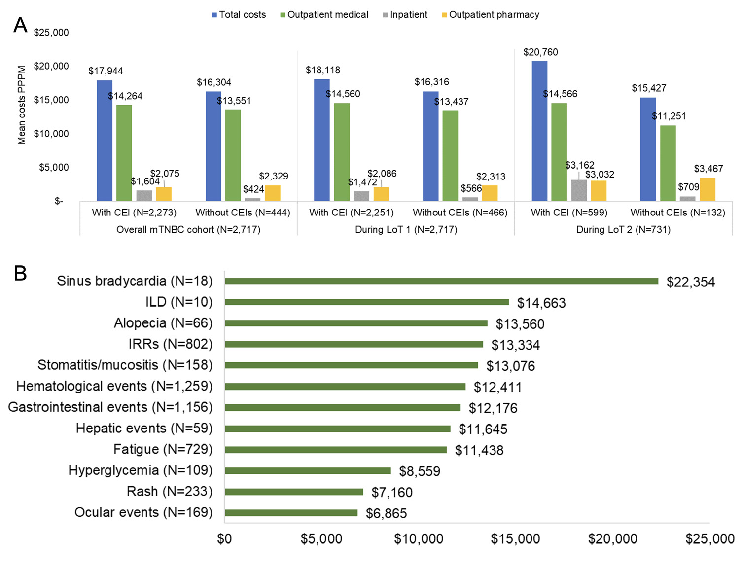CEI-related costs accounted for 35% of all-cause costs during follow-up and a larger proportion of all-cause costs in LOT 1 (51%) than LOT 2 (41%). Outpatient medical costs accounted for more than 50% of CEI-related costs. Across all treatment categories, mean all-cause healthcare costs PPPM were numerically higher among patients with vs without CEIs within 12 months of LOT initiation, which suggests that patients with CEIs experience both a greater clinical and economic burden than those without CEIs. While sinus bradycardia and ILD had the highest mean 14-day CEI-related costs, these CEIs were the least common and further data are needed in larger cohorts to confirm these findings.