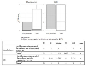 Comparison of ICERs between products with and without usefulness premiums granted for attributes not fully captured by QALYs: Nine products received usefulness premiums for attributes not fully captured by QALYs. Summary statistics of ICER scores for both the manufacturers and C2H were calculated for products with and without such usefulness premiums and are presented in Figure 2.