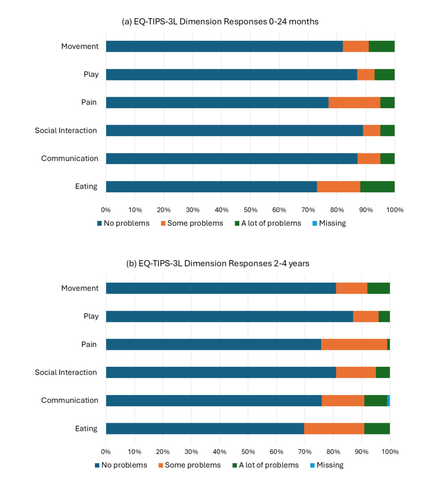 The EQ-TIPS-3L had the highest report of problems for the dimensions of eating and pain across the 0- to 24-month (Figure 1a) and 2- to 4-year groups (Figure 1b). There was an increase in problems reported with communication in the 2- to 4-year group compared with the 0- to 24-month group. There were missing responses for communication in the 2- to 4-year group only (1%).