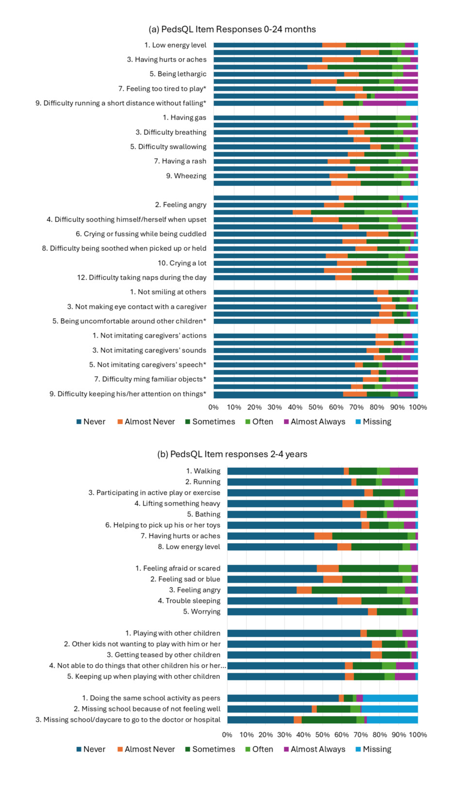 The PedsQL similarly had high reporting of never having a problem across most items. For the 0- to 24-month group (Figure 2a), most problems (>50%) were reported in physical functioning for “feeling tired” and “resting a lot,” and in emotional functioning for “crying or fussing when left alone” and difficulty soothing himself/herself when upset." “Crying or fussing when left alone” had the highest report of problem across all PedsQL items. “Feeling afraid or scared” (7%), difficulty running a short distance without falling" (13-24 months, 6%), and “feeling angry” (5%) had the highest report of missing items.