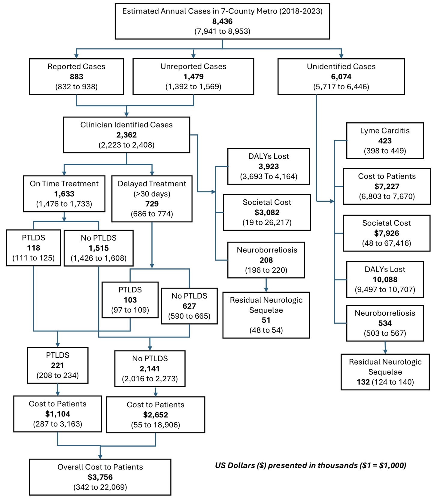 Simulation 1 estimated 8436 (95% CI, 7941-8953) annual cases in the Minnesota Twin-Cities metropolitan area (Figure 1). Over 2300 estimated cases were diagnosed and treated by a physician with over 6000 unidentified cases. Among clinician-identified cases, we estimated over 700 cases with delay to treatment, 200 cases of PTLDS, 200 cases of neuroborreliosis, 3900 DALYs lost, more than $3.7 million in overall costs to patients, and $3.1 million in societal costs. Among unidentified cases, we estimated over 400 cases of Lyme carditis; 500 cases of neuroborreliosis, including 100 with residual neurologic sequelae; 10 000 DALYs lost; $7.2 million in patient costs; and $7.9 million in societal costs annually.