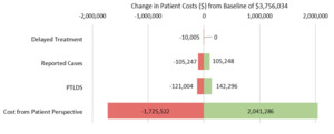 The sensitivity analysis suggests the model to be robust when exploring overall cost to patients, the most downstream outcome in the model structure. Given the wide CI for the cost parameter input, it is unsurprising that changing this estimate has the largest effect on the simulated value. Variation in the delay to treatment estimate has the smallest effect on patient costs, probably due to relatively narrow confidence limits of the estimate. Findings from this analysis suggest that the overall impact of a parameter estimate is primarily influenced by two factors: its position within the model hierarchy and the breadth of its confidence interval. PTLDS does not have a particularly wide CI, but is the second most influential parameter, likely due to its position in the model structure and it’s downstream effects on cost.