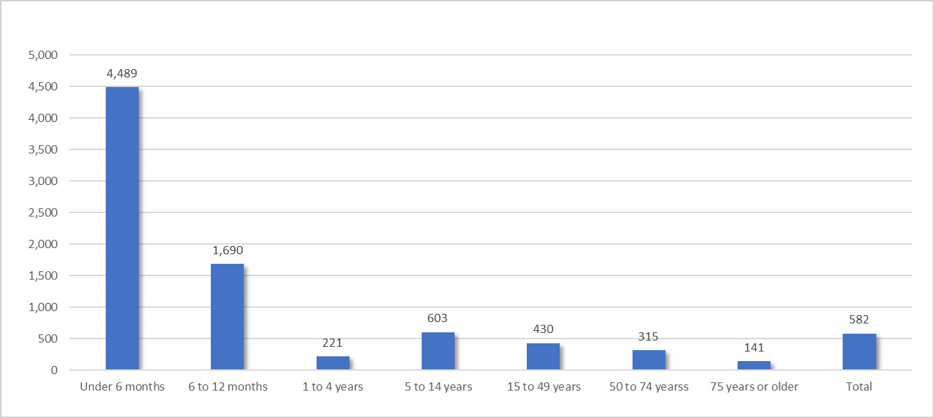 When examining average costs per patient, the overall mean was estimated at $2579 (95% CI, $1063-$4096). The highest per-patient costs occurred among individuals aged 15 years or older ($3540; 95% CI, $1171-$5908), reflecting more severe clinical presentations and intensive resource utilization within this age group. The second highest costs were found in children under 1 year, whose average cost was ($1677; 95% CI, $1430-$1925). Conversely, the lowest average cost per patient was identified in children aged 1 to 14 years ($1535; 95% CI, $796-$2274). Table 3 presents detailed cost estimations by age group.