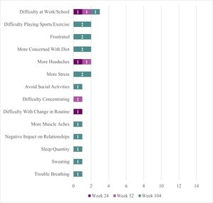 During Week 104 interviews, participants commonly reported improved appetite (57%, n = 4/7), blood sugar stability (43%, n = 3/7), less anxiety (43%, n = 3/7), and less tiredness (43%, n = 3/7). New changes reported during Week 104 included less irritability (29%, n = 2/7) and less nausea (14%, n = 1/7).