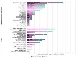 Signs/symptoms: Across interview timepoints, participants most commonly reported improved blood sugar stability, more energy, less anxiety, less shakiness, improved appetite, less tiredness, weight loss, and less dizziness (Figure 1).