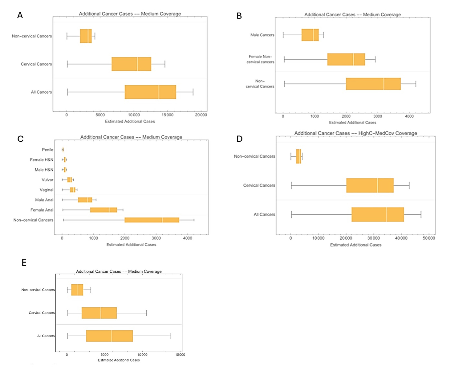 Scenario analysis: Figure 2D and 2E correspond to Figure 2A but reflect different assumptions regarding higher cervical cancer incidence and greater 1-dose vaccine effectiveness. In both scenarios, the majority of additional cancer cases prevented by the 2-dose 9vHPV program were cervical cancers. However, in the higher incidence scenario (Figure 2D), the distinction between the two programs became more pronounced. The assumptions of increased 1-dose vaccine effectiveness in Figure 2E diminished the gap between the two programs. The estimated additional noncervical cancer cases in these alternative scenarios remained consistent with the base case as they maintained identical baseline incidences.