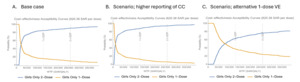 Uncertainty in 1-dose effectiveness parameters: The analysis incorporates uncertainty in the effectiveness of the 1-dose program, drawing from the analysis of KENSHE and IARC India study data. This includes exploring variations in the mean duration of protection, with the base case reflecting a mean duration of protection of around 10 years, while the expanded analysis considers a mean duration of protection of about 20 years.