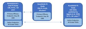 Patients in the remestemcel-L-rknd study were younger, aged between <1 to 17 years (median of 7 years), whereas the ruxolitinib study included older patients aged 18 to 72 years (median of 57 years). At baseline, the proportion of males in the remestemcel-L-rknd study was higher than the ruxolitinib study (64% versus 47%). Approximately half of the patients in the remestemcel-L-rknd study were white, compared with nearly all patients in the ruxolitinib study (56% versus 92%). In addition, a greater proportion of the remestemcel-L-rknd patient population had more severe disease (grade III-IV) at baseline compared with the ruxolitinib patient population (89% versus 73%). Patient baseline characteristics from the two ruxolitinib and remestemcel-L-rknd studies are presented in Table 1.