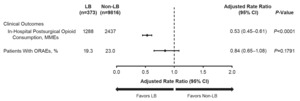 Overall, the LB cohort consumed 47% fewer in-hospital postsurgical opioids than the non-LB cohort (adjusted MMEs, 1288 vs 2437; P<0.0001) (Figure 2). Across all procedures, the proportion of patients who experienced ORAEs was not significantly different between the LB and non-LB cohort (adjusted proportion, 19% vs 23%; P=0.1791). Unadjusted values are provided in Supplemental Tables 4 and 5.