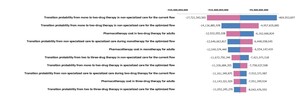 One-way sensitivity analysis was performed with +/- 20% range of each parameter. The result of the one-way sensitivity analysis is presented as a tornado diagram in Figure 2. Although the point estimate of cost-saving in the base case analysis was JPY9.5 billion, there was no parameter to have a cost-increase potential in the worst range. If the most sensitive parameter for the incremental cost effectiveness ratio value, the transition probability from mono to two-drug therapy in non-specialized care for the current flow, was assumed to be the worst case, the budget impact calculation can be JPY-469 953 697.