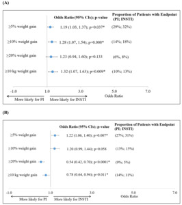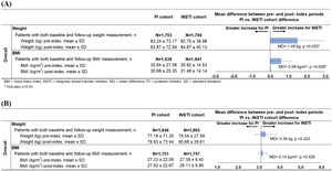 Outcome models: Multivariable regression models were used to compare the outcomes of interest between IPTW treatment cohorts. Ordinary least-squares models were used to model absolute and expected percent change in weight and BMI, as a function of the independent variable (INSTI- vs PI-based regimens) and covariates. P values and 95% confidence intervals (CI) were calculated. The expected proportion of patients having weight/BMI increases as a function of the independent variable (INSTI- vs. PI-regimens) and covariates was modeled using logistic regression. A P value <0.05 was considered statistically significant for all analyses.