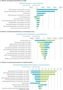 One-way sensitivity analysis: One-way deterministic sensitivity analyses, shown in the tornado diagrams in Figure 2, demonstrate that the ICER (Figure 2A) and incremental health benefits (Figure 2C) results are most sensitive to the age parameters, whereas the incremental cost results (Figure 2B) are most sensitive to the annual cost of the polypill.