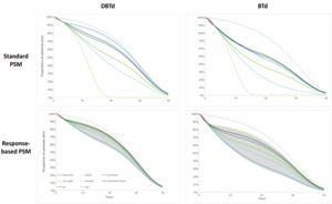 Although the uncertainty of the response-based PSM estimates was lower than that of the standard PSM between and within parametric extrapolations for both the DBTd and BTd arms, the reduction in uncertainty associated with the response-based model was greater for DBTd (Figures 2 and 3).